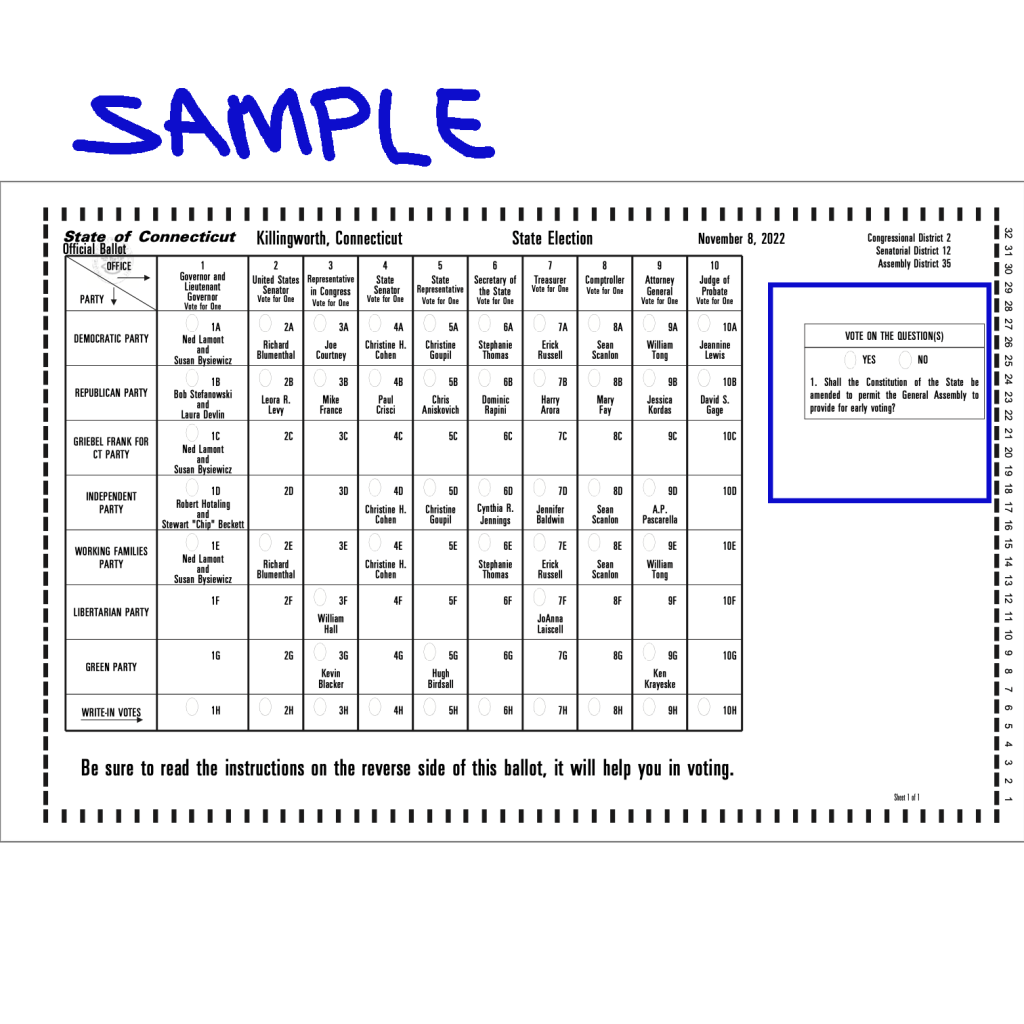 In Killingworth, the Early Voting question box will be on the front of the ballot!