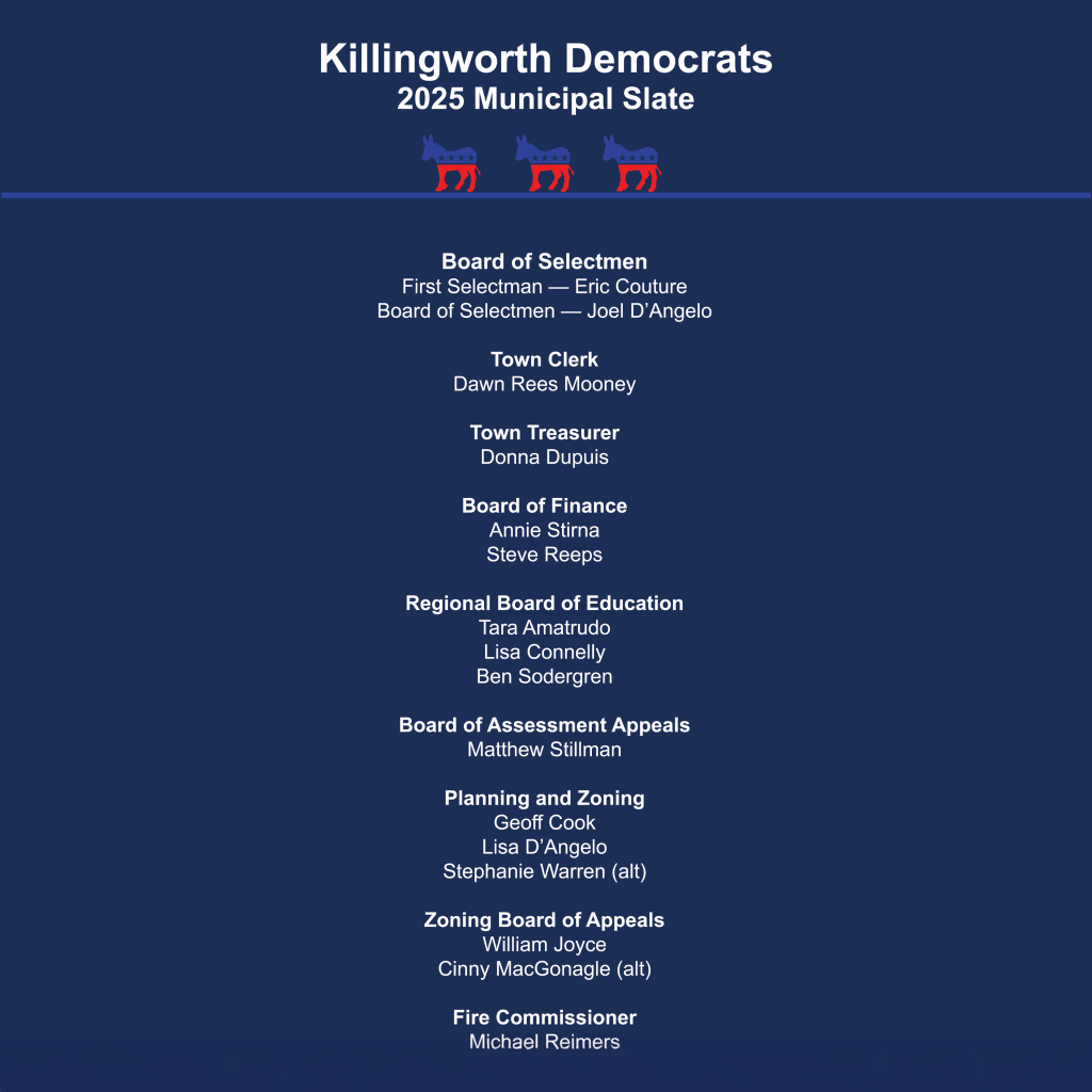 The Killingworth Democratic Town Committee is proud to announce the 2025 Democratic slate of candidates for town offices, unanimously endorsed by the Killingworth Democratic caucus: